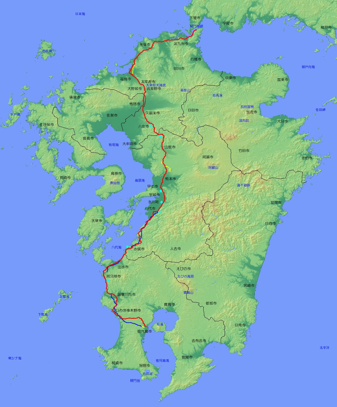 | 主な経由地 | 福岡県北九州市〜宗像市〜福岡市〜大野城市〜太宰府市〜筑紫野市〜 〜佐賀県鳥栖市〜 〜福岡県久留米市〜八女市〜 〜熊本県山鹿市〜熊本市〜宇土市〜宇城市〜氷川町〜八代市〜水俣市〜 〜鹿児島県出水市〜阿久根市〜薩摩川内市〜いちき串木野市〜鹿児島市 |
