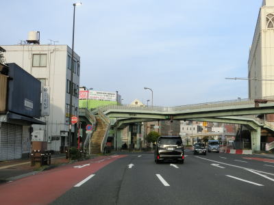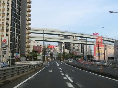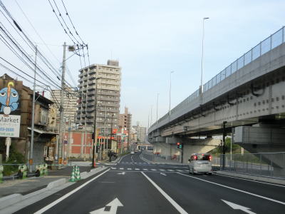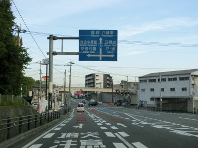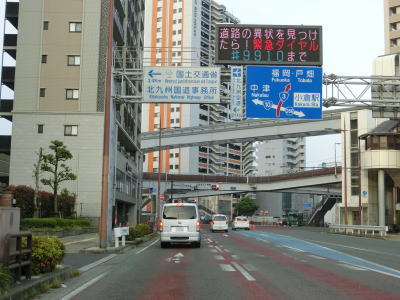 | 清水跨線橋でJR日豊本線の上を通過して平面道路を少し走り、福岡r296金鶏町交差点を右折して福岡・戸畑方面に進む。右折車線は2本設置されているが、元々の右側車線とそこから分岐した車線のため、左側車線からの右折はできず右側車線を走っていなければならない。 | ||