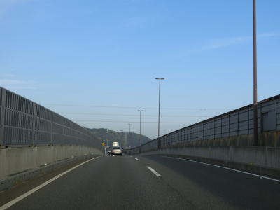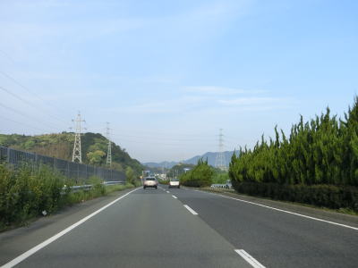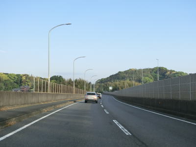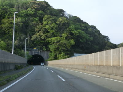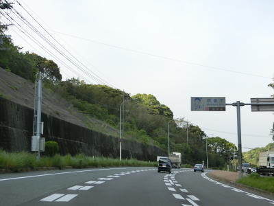 | 野間ランプ付近からは山間部を通っており沿線の家屋も途切れる。岡垣トンネル、次いで城山トンネルをくぐり、右カーブの途中で宗像市に入る。市町境付近で合流してくる側道は旧道であろう。 | ||