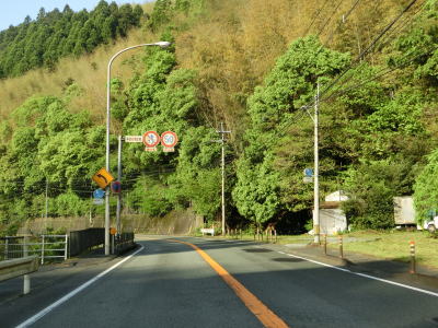 | 吹春交差点以南も辺春川沿いの対面2車線道路という点に変化はないが急なカーブが多くなる。屈曲ありの警戒標識に曲線半径を記した補助標識が取り付けられている。数値は100〜120mとそれなりに急なカーブである。丸山橋を渡ってからは急カーブは少なくなり中辺春集落を通り抜ける。 | ||