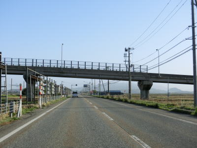 | 藤沢交差点を過ぎると上り勾配となり坂町跨線橋でJR米坂線を越える。米坂線は2022年8月の豪雨で被災し、一部区間(今泉駅〜坂町駅)では2024年4月の時点でも運休している。荒川に架かる荒川橋付近からはJR羽越本線と近い位置での並走が再開し、平坦な直線道路という状況は新発田市と似たような状況である。 | ||
