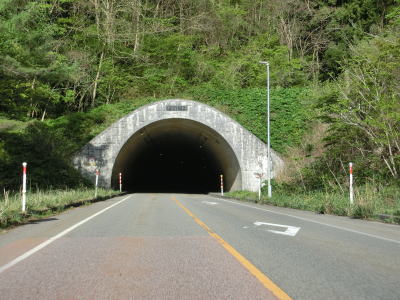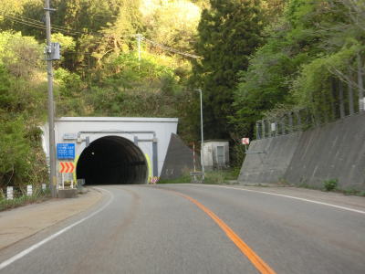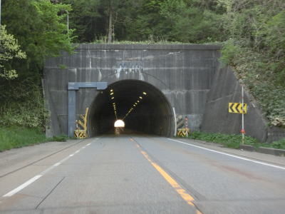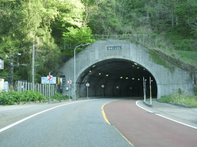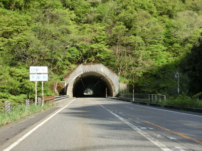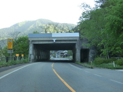 | 蛇ノ沢1号洞門を出てすぐに朝日トンネルに入る。トンネルから下り勾配となり、出口には長い下り坂かつカーブが多いため速度に注意する旨の警告看板が設置されている。とは言うものの勾配は1.5%なので特別急という訳ではない。大型貨物車両の通行が多い幹線国道としてはという事だろう。 | ||