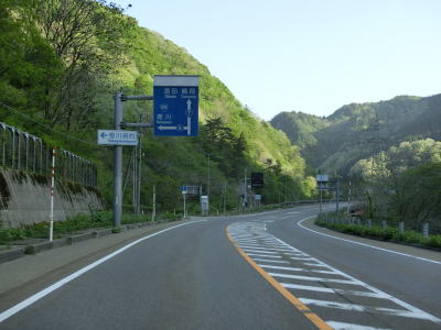 | 葡萄集落を過ぎると6kmに渡る異常気象時通行規制区間に入る。連続雨量が210mmを超えると通行止になる。大型貨物車両の交通量が少なくない区間だが、閉鎖ゲートの前に転回できる駐車帯等は設置されていない。 異常気象時通行規制区間に入って少し走ると新潟r6交差点を通過する。左折してr6を走ると日本海沿いのR345に行く事ができる。朝日橋で葡萄川を渡って蛇ノ沢3号洞門、蛇ノ沢2号洞門、蛇ノ沢1号洞門をくぐる。洞門は2つしか確認できない事から、3号と2号もしくは2号と1号が延伸で繋がったと思われる。 |