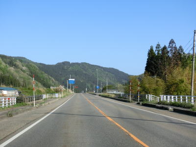 | 道の駅から少し走ると建設中のE7日本海東北道の交差予定地点を通過するが、朝日まほろばICに近いためインターチェンジは設置されない。その後もセンターライン付きの2車線道路を淡々と北上する。新潟r291早稲田交差点を通過し、程なくして塩野町橋を渡って左カーブを曲がって新潟r310交差点を通過する。E7日本海東北道が未供用の区間だが、交通量はさほど多くなく流れは良好である。 | ||