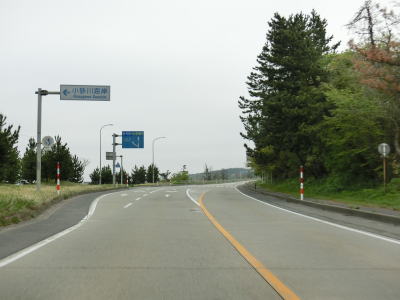| にかほ市に入ってからもアップダウンを繰り返す2車線道路が続いており、日本海のある西側が開けている。小砂川集落を通り抜ける旧道と思われる市道との交差点を通過した後に小砂川こ線橋を渡る。 | ||
