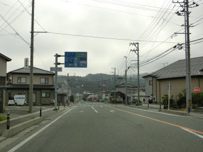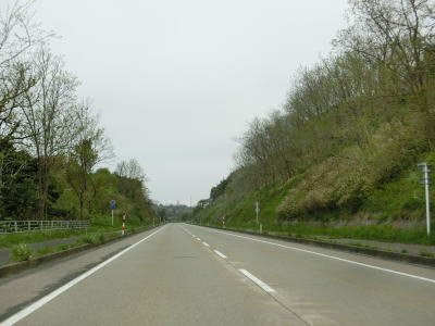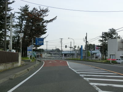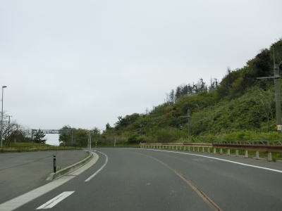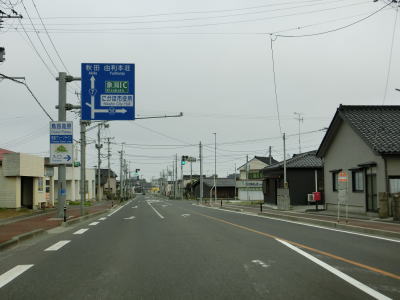 | 郵便局前交差点からの緩やかな左カーブを曲がっているとE7日本海東北道の仁賀保ICを通過する。その後はJR羽越本線とE7日本海東北道に挟まれた状態になる。標高20〜30mの位置を走っており日本海のある西側が低いのだが、眺望が利く場所は意外に少ない。 | ||