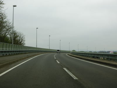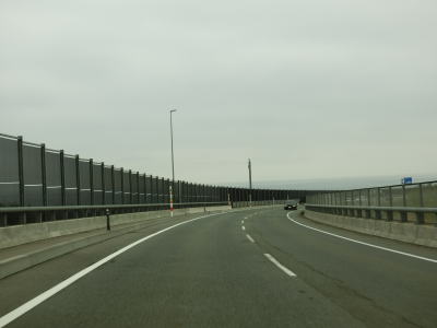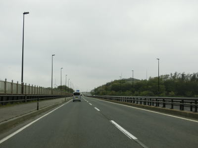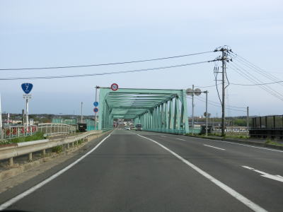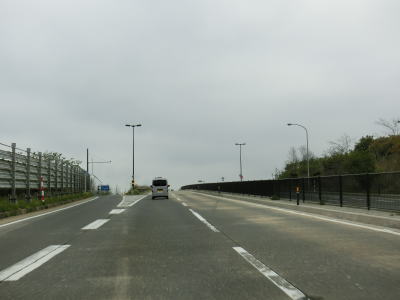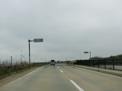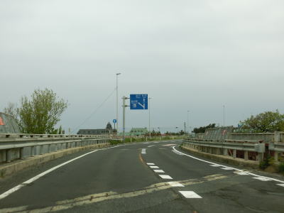 | 対面2車線道路に戻ってすぐに勝平はまなすトンネルと勝平シェッドをくぐる。勝平はまなすトンネルは片側2車線分で造られているが、勝平シェッドは2車線分しかない。右カーブを曲がりながら臨海大橋で旧雄物川(秋田運河)を渡る。 | ||