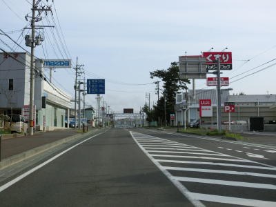 | 臨海大橋を渡り終えると同時に直線道路になり短い勾配を下った先でR13・R46・R101・R285・秋田r26臨海十字路交差点に至る。R7は左折して大館・能代方面に向かう。案内標識に表記されていないR46はR13に、R101とR285はR7能代方面に重複している。なお、R7を除いた国道は全て起点もしくは終点である(R13、R46、R101は終点、R285は起点)。r26は停車場線で約3.7km東に秋田駅がある。なお、秋田駅はこれまで並走していたJR羽越本線の終着駅である。 | ||