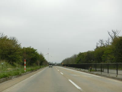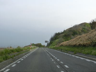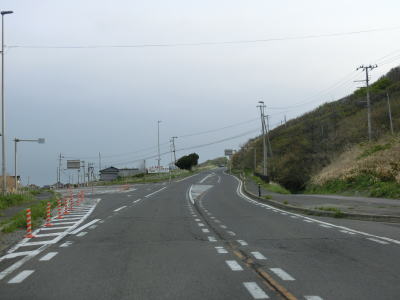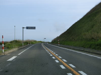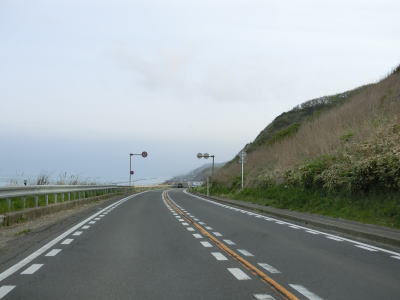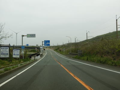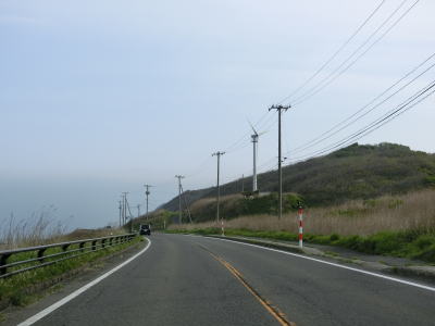 | 緩やかなアップダウンを繰り返しながら、また日本海を望みながら2車線道路を快走する。強風が吹きつける地域とあって風力発電用の風車が点在している。荒々しい雰囲気ながら道路状況は良好である。 | ||