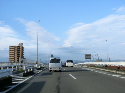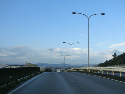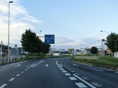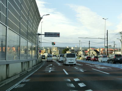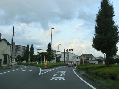 | 左側の車線がなくなる事を示す車線数減少の警戒標識が確認できるが、その先の左側車線には何も起こらず右側車線が万町交差点の右折専用車線になってしまう。万町交差点からは対面2車線道路になり、さらに幅員減少の警戒標識も確認できるが、特に道幅が狭くなる訳ではなく上り勾配が始まる。 | ||