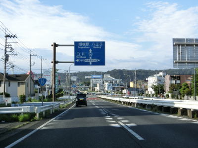 | 川口川橋と浅川橋を渡るが、後者は橋上にバス停が設けられている。中央分離帯がなくなってしまう一方で歩道が広くなる。R20のバイパスとしての機能を持っている北大通りとの大横町交差点を通過する。 八王子駅の北西でR20・東京r506八幡町交差点に至り、左折して相模原・新宿方面に進む。交差点の直前に設置されたR20のおにぎり下の補助標識の矢印が左右を向いており、以降はR20が重複している事が分かる。 |