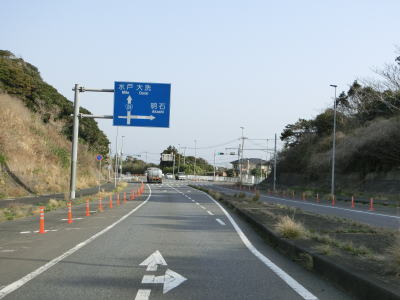 | 緩やかな勾配を下り切ると清水交差点を通過するが、明石方面の市道はR51の旧道である。清水交差点以北は通常の対面2車線道路となる。車線幅はさほど広くないが、勾配、カーブともに非常に緩やかである。海に近い場所ではあるものの海岸線とは400〜600m程度離れている。 | ||