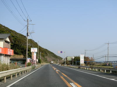 | 116.清水交差点 | 117.対面2車線道路で台地を走る | 118.海産物の土産物店あり |
