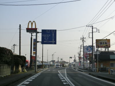 | 最も海に近い国道ではあるが、海岸線からは離れており海は全く見えない。急カーブに注意を促す標識が設置されているが、以降は緩やかなカーブばかりである。カーブが落ち着きイオンモール銚子の北で千葉r286三崎町2交差点を通過する。 | ||