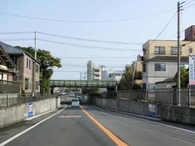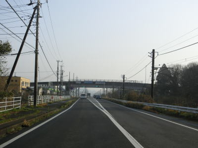 | 千葉r266袋東交差点を過ぎると沿線の建物が少なくなる。緩やかな右カーブを曲がっていると総武本線跨線橋でJR総武本線の上を越えるが、前後の勾配が非常に緩やかなので跨線橋を通っている印象は薄い。右カーブが終わって直線道路になった後に千葉r71網戸交差点を通過する。 | ||