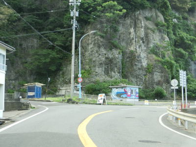 | 断崖の下を走っているとさらに一本木隧道と森腰隧道をくぐる。玉山隧道から森腰隧道にかけての4つのトンネルは1970年から1971年にかけて造られており、センターラインはあるものの車線幅がやや狭い。高波注意の警戒標識を通過して下った先で梅浦集落に差し掛かる。 | ||