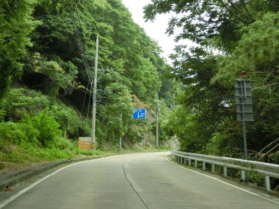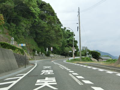 | 河野交差点からは海岸線から離れて上り勾配になった2車線道路を走る。潮見トンネルをくぐって河野川の流域を走っていると右の急カーブを曲がる。赤萩集落を通り抜けている町道との交差点を通過するが、この町道は旧道と思われる。 | ||