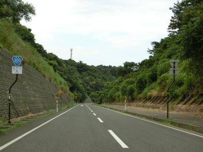 | 梅浦交差点からはR365に替わってR417が重複しているが、格下の国道のため表に出ているのはR305のみである。交差点からしばらくは狭いながらも両側に歩道が設置されているが、新保港付近は歩道がなくなってしまう。国道のすぐ傍に家屋が建っているせいもあって走りやすいとは言い難い。城ヶ谷漁港付近を過ぎると緩やかなカーブが多くなり、程なくして黒崎トンネルをくぐる。 | ||