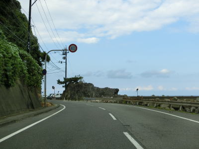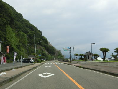 | 海に近く高低差が小さいため高波に注意を要するものの改良済みの2車線道路を快走する。町境を越えて南越前町に入る。山寄りには白竜の滝があり、道路に平行な駐車スペースの他に小規模な庭園が設置されている。 | ||