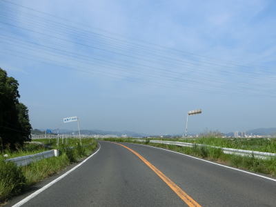 | 422.対面2車線道路が続く | 423.岡山r428片島交差点 | 424.高梁川の堤防上を走る |