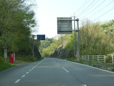 | 広島r423交差点を通過し、市道が交差している左の急カーブを曲がると狭い谷筋を上って行く。上り勾配の途中で府中市に入る。平成の大合併以前は上下町だった地域だが、庄原市の境標識とは異なり「府中市上下町」とはなっていない。 | ||