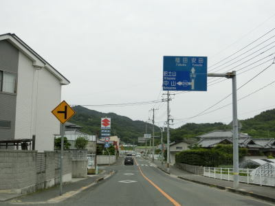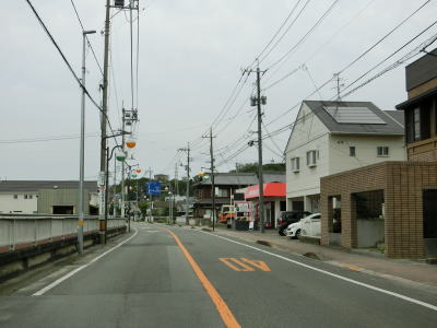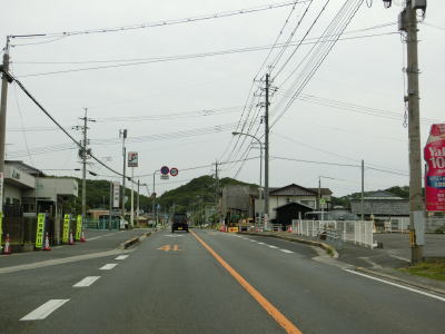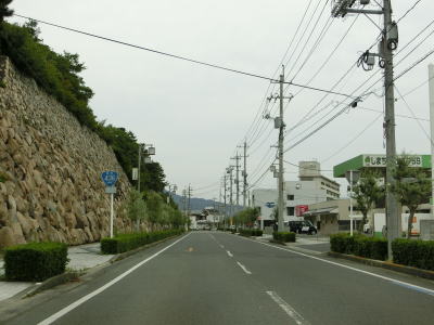 | 渕崎交差点の直後は平坦だが沿線の家屋が少なくなると同時に上り勾配が始まる。峠部分を池田湾を望みながら緩やかな勾配を下り、平坦になる辺りで町境を越えて小豆島町に入る。全国チェーンの店があるせいか、離島に来たという雰囲気はいまいち感じずらい。 | ||