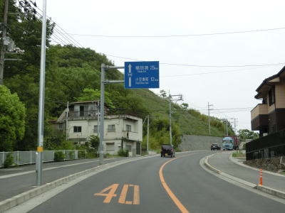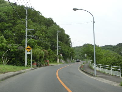 | 迎地交差点を過ぎると上り勾配となり、池田大池の北端部を過ぎると沿線の家屋が殆どなくなる。標高80mの大峠を越えると旧内海町に入る。上り勾配となる反対向きの車線にはゆずり車線が設置されている。 | ||
