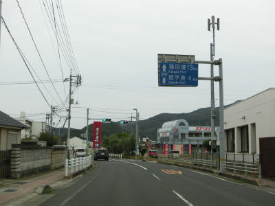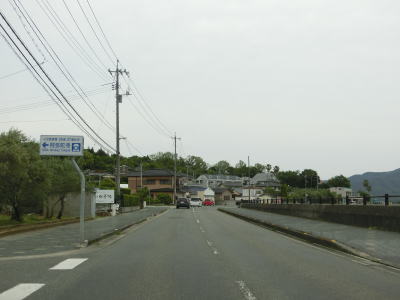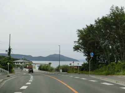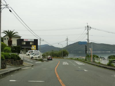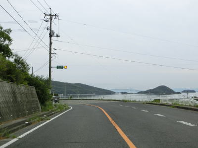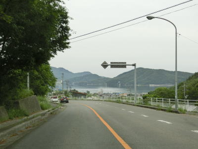 | オリーブ公園入口交差点を過ぎて少し進むと海沿いを走るようになる。鬼ヶ崎には自販機が設置された簡易パーキングがある。その端に福田港までの距離と土庄港までの距離が表記された看板が設置されており、前者は16km、後者は12kmである。海岸線から離れる事はあるが概ね海に沿っており、内海湾の向こう側の田浦半島もよく見える。 | ||
