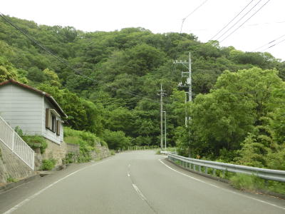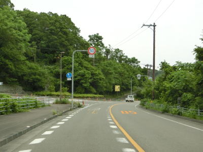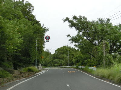 | 橘集落に差し掛かると勾配が幾分か緩やかになる。集落の向こう側に拇指嶽や千羽ヶ嶽らしき岩山が見える。下り勾配が終わる手前に幅員減少の警戒標識が立っており、その直後にセンターラインがなくなって道幅も1.8車線とやや狭くなる。橘橋を渡った先の左側に空き地が確認できるため、拡幅の計画が存在しているようである。 | ||