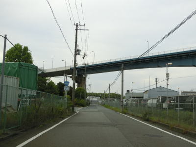 | 飾磨雨水ポンプ場の反対側には植栽付きの歩道があるものの延長は50m強と僅かである。歩道付近からは道幅が2.0車線になり、乗用車同士であれば比較的容易に離合できるようになる。船舶の往来できる高さを確保するため高い位置に架けられた飾磨臨海大橋をくぐる。橋の東側は通常の勾配だが、西側はループで高低差を生じさせている。 飾磨臨海大橋の直後に右の急カーブを曲がる。かつてはカーブの直後に国鉄飾磨港線が横切っていたが、1986年に廃線となっており踏切は撤去されている。飾磨港駅の跡地には姫路みなとドームが建てられている。 |