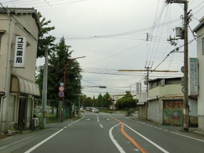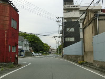 | 右急カーブのすぐ先に市道が交差しているY字路があるが、国道は道なりに右方向ではなく左折しなければならない。前述のとおりフェリー港と市街地のメインルートでないせいか、案内標識の類は設置されていない。 Y字路以降も2.0車線幅道路を走り、約100m先でセンターライン付きの2車線道路に突き当たる。この交差点にも案内標識が設置されていないが、右折が姫路市街地方面である。ウォっちずを見ると左折方向の道路も国道に指定されているようだが、港湾道路(?)との交差点までの100m弱の支線である。なお、2021年発行のスーパーマップルではY字路〜支線交差点間のルートが誤っている(国鉄飾磨港線跡に道路が描かれており南向きの一方通行となっている)。 |