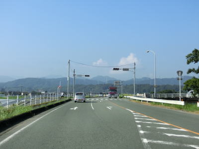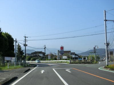 | 糸田交差点から程なくして新糸田橋を渡って緑川の右岸の平坦地を走る。緩やかな短い勾配を上って堤防上を走っていると熊本r240有安交差点を通過する。御船町と甲佐町のそれぞれの中心部を結ぶルートながら交通量はさほど多くない。 | ||