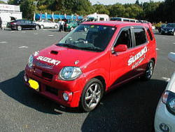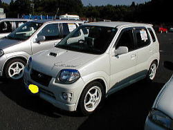 涼木競さんのkeiスポーツ。白のボディに白のアルミとなかなか決まっている。青のアイラインもお洒落。ちなみにシフトノブは私と同じのが付いていました。はたして気付いてられたかどうか |