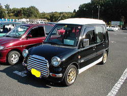 まーしー。さんのH31Aミニカ。ペタペタ仕様とのことだが、そのペタペタぶりは想像を絶するものがある。ミニカの中でも異様な光を放っていました。と言うよりミニカとは思えない。他にもHID、ワイパーレス等いじり倒されている。来月車検なのだがその対策は…?? ちなみに今回集まったミニカの中では唯一の5ドア。 |