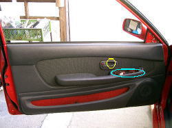 まずはドアトリムを外す。パワーウィンドウのフィニッシャー(青丸)を外してハンドル部のネジ(黄色丸)を外す。クリップを全て外しハンドルを抜いてから、上に持ち上げるようにすると簡単に外れる。 パワーウィンドウフィニッシャーに繋がっているハーネスを外すのを忘れてはいけない。 |