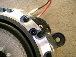 取付部を拡大。微妙な穴位置のズレを間にゴムを噛ませる事で解消させているのが分かる。 他に説明書には触れられていない作業として、スピーカーの線の付替え作業がある。スピーカーと車体のコネクター形状が全く違うのだ。これは純正スピーカーからある程度の長さの所でぶった切ってギボシ端子をはめ込んでから接続する。慣れていないと結構面倒な作業。 |