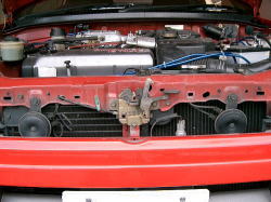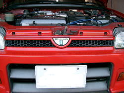 これでグリルを付けて終了、となればいいのだがデトマソの場合はそうもいかない。純正と比べて厚みが増しているので、グリルがつっかえてきちんとはまってくれません。ステーを奥に曲げるとラジエータと異常接近してしまう。となるとグリルの内側を削るしかない。 |