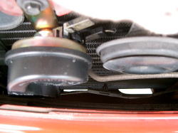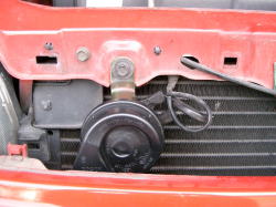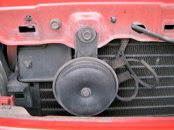 削ったグリルを元通り付けるとホーン交換終了。ホーン交換自体は15分程度でできますが、グリル加工が加わるので30分ちょっとかかっています。。ちなみに某大手カーショップでは工賃は3,500円です(2004年4月現在)。グリル加工は別料金かな? |