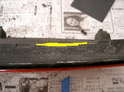 サンダーがあれば簡単なのだろうが、一般人が自前で持っているはずもない。私の場合は爪折りで使った糸鋸でムリヤリ削ってみました。使い方を間違えているような道具に思えますが、なんとかホーンの当たる位置だけ削り取ることができました。下の写真の黄色い部分が削り取った部分で、数ミリ程度でグリルの穴3個分です。 |