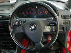 これもイタリアの有名メーカー、ナルディ社製のもの。GARA3がベースになっており、360mmという径で本皮巻きである。赤のステッチがこれまたオシャレである。これも買うとなると結構お高く4万円くらいするものである。 センターのカバーの下部にダイハツのロゴが入っているのだが、取って付けた様な感は否めない。 |