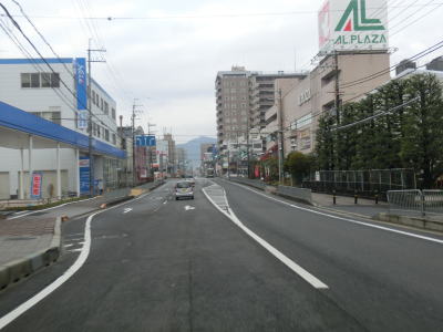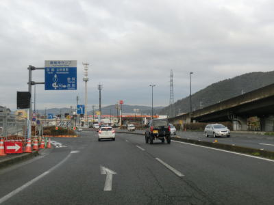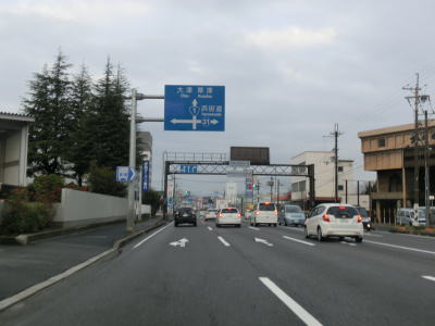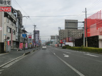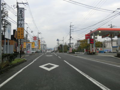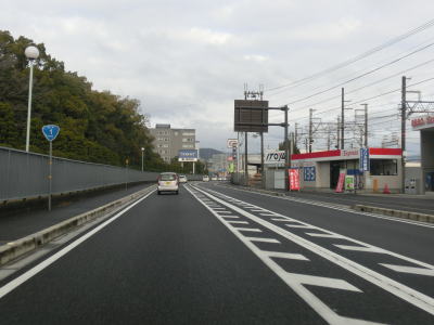 | やけに長い左折車線を持つ一里山1交差点を通過し、交通量の多い2車線道路を南西に向かって走る。写真では交通量が少ないように見えるが、これは早朝という時間帯のせいであって昼間であれば常時渋滞気味の場所である。大江3交差点を道なりに右へ進むが、左の市道へ進む車両も多い。なお、市道を進み神領交差点を直進すると瀬田西IC、右折すると瀬田の唐橋に行く事ができる。 | ||