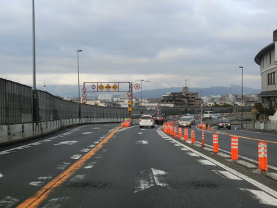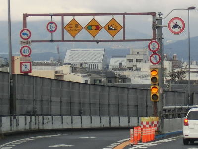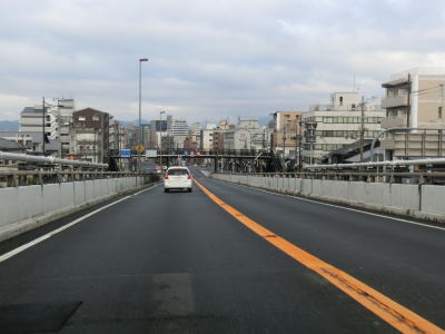 | 東山五条交差点の上を通過すると下り勾配となり、跨道橋を出ると交差点からの車線が合流して西向き車線は合計5車線となるが、左端と右端の車線は直後の交差点でそれぞれ左折車線、右折車線になる。その後は片側4車線道路を西の方角に進むが、川端通との川端五条交差点で左端車線が左折車線になる。片側4車線の堀川大橋を渡った先の河原町通との河原町五条交差点では右端車線が右折車線になる。これらの短距離での車線の変化を考えるとR1を西進するのであれば左右どちらも端の車線は避ける方が良いだろう。 | ||