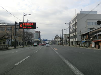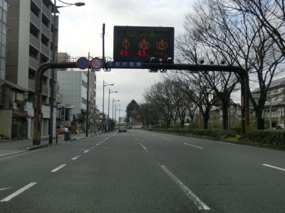| 堀川五条交差点の左折車線は1本だけであったが、交差点の先は片側3車線もある。一見すると片側4車線に見えるが、左端は車道ではなく路側帯という位置付けである。約300m進むと西本願寺の北東でS字カーブを描いているが、これは西本願寺の敷地を避けるための処置だろう。S字カーブがあるためある程度減速しなければならない場所だが、カーブの先には自動速度取締機が設置されている。 | ||