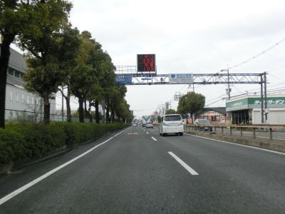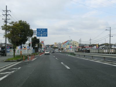 | 峠からの勾配を下り切ってからも完全に平坦な状態にはならず、非常に緩やかなアップダウンが続いている。京阪間の幹線国道とあって交通量が多く、片側2車線であっても流れの悪い事が多い。「○×まで△分」という、距離ではなく時間を示す電光掲示板が設置されているのも渋滞しやすい幹線道路ならではの設備だろう。 | ||
