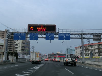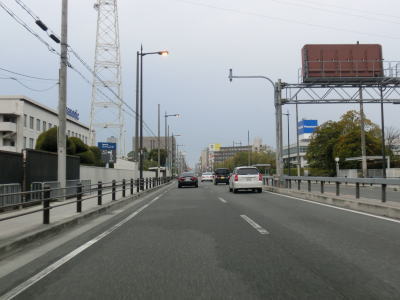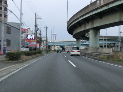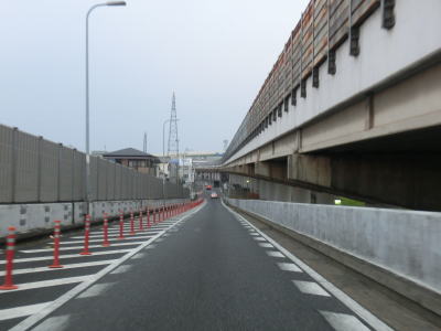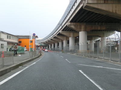 | 守口市に入ってしばらく走ると緩やかな上り勾配となって高架道路区間に入る。北を流れている淀川の堤防より高くなり平坦になった所で側道と本線とに別れる。本線もR1として表記されている事が多いが、案内標識では側道にだけR1のおにぎりが表記されている。よってここは側道に進む。 | ||