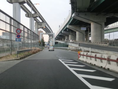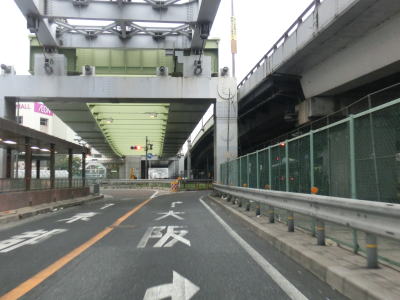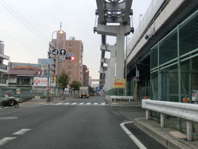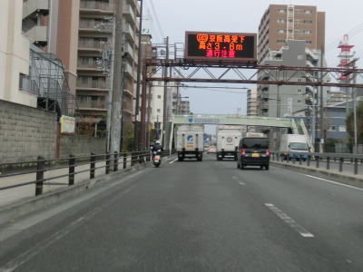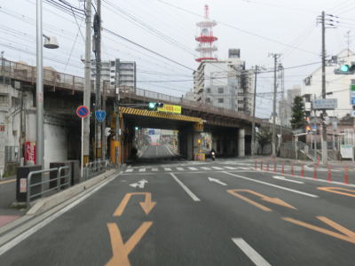 | 引き続き地下鉄谷町線の上を走っていると阪神高速の高架下を通過する。これは14号守口線に当たるが、本線ではなく森小路支線である。阪神高速の高架から少し進むとR163関目5交差点を通過するが、交差点の前後でカーブしているので通過の際は多少注意しなければならない。ここで大日交差点から下を通っていた谷町線は南西の市道へ移り、以降は今里筋線の上を走る形になる。なお、これまでいくつも警告があった通り、左折してR163に進むと制限高3.8mの京阪本線のガードがある。関目5交差点からはR163が重複しているが、その事を示す標識等は存在しない。 | ||
