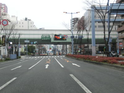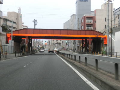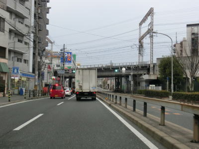 | 蒲生4交差点から程なくしてオレンジ色の高さ制限バーを併設したガードをくぐる。城東貨物線という事になっているが、2018年頃にJRおおさか東線(放出駅〜旧梅田貨物駅)として開業する予定である。そのすぐ先でもガードをくぐるが、こちらは京阪本線である。桜小橋交差点を通過して都島区に入ってすぐにガードをくぐるが、これはJR大阪環状線である。すぐ近くに京橋駅があるため、ガードを挟んだ区間は客待ちタクシーの路上駐車が多い。タクシー以外の路上駐車車両も少なくなく、昼間は左側車線が機能していない事も多い。蒲生4交差点から下を走っていた地下鉄長堀鶴見緑地線はここで南西の方角にずれている。 | ||