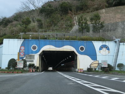 | 関門道の門司港ICと接続している福岡r72との東本町2交差点の先で関門トンネルの門司料金所を通過する。料金は普通車で150円(ETC利用不可)であり、関門道の360円(普通車の通常料金。ETC料金は280円)よりも低く設定されている(2018年2月現在)。フグの口が描かれた坑口からトンネルに入るが、開通した年は1958年と60年前とあって対面2車線である。延長は3641mと5000mを下回っているが、海底トンネルのため危険物積載車は通行できない。また、歩行者・自転車・原付が通行できるスペースが車道の下部に設けられている。料金は歩行者は無料で自転車・原付は20円である。人道用トンネルは6〜22時までしか利用できない点に注意を要する。 | ||
