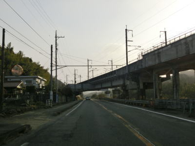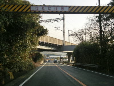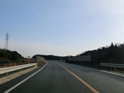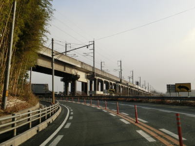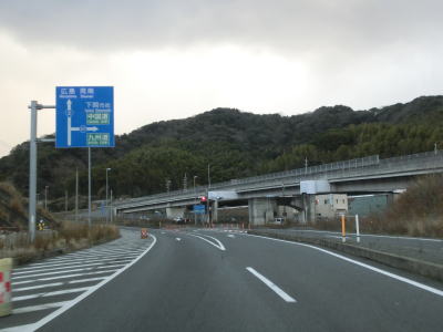 | 杣尻高架橋を渡り終えると同時にR9・R316・山口r71杣尻ランプの側道が分岐する。杣尻東跨道橋で杣尻交差点の上を通過し、なおも上り続けていると荒草高架橋で山陽新幹線の上を通る。南側にしかフェンスが設置されてないのは左側はトンネルになっているためと思われる。 | ||