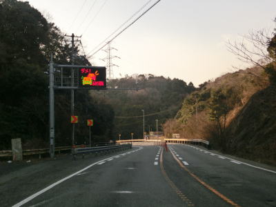| 山口r34のランプからの緩やかな勾配を下った後に上り勾配となり、中国道の下を通過する。さらに少し上ってから下り勾配となり、再び勾配を上っていると長府トンネルをくぐる。対面2車線という、これと言って特徴のない道路状況だが、乗用車だけでなくトラックも含めて交通量が非常に多い。 | ||